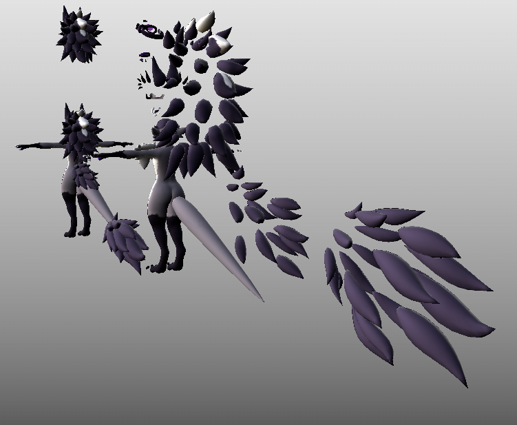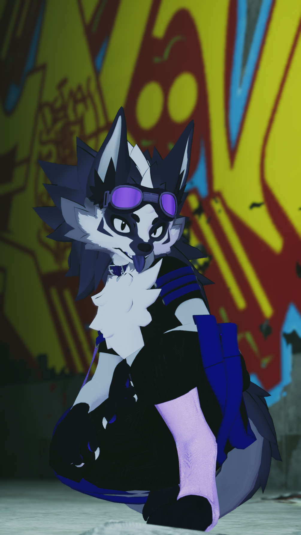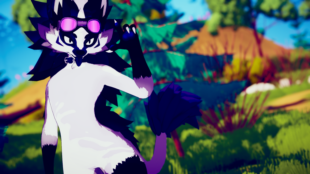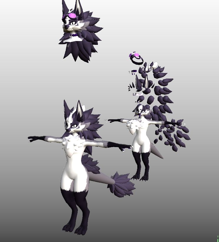 A zip file containing three textures (body + fluff + eyes) with materials set up with Poiyomi 8.2 Outline + Basic Emissions + shading set up